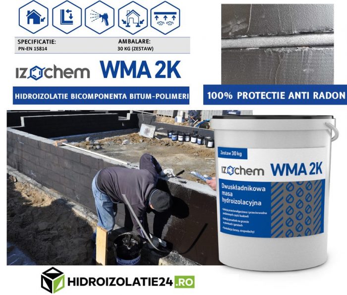 Izochem WMA 2K este o hidroizolatie pe baza de bitum si polimeri pentru hidroizolarea și lipirea plăcilor termoizolante. Este clasificat drept hidroizolație de tip greu pentru apele subterane sub presiune. Cea mai bună și mai eficientă protecție împotriva apei stagnante și a apelor care conțin resturi biologice cu diferiți coeficienți de aciditate.